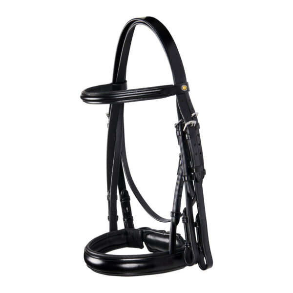 Briglia da dressage in morbido cuoio italiano, con fibbie in acciaio inox che gli conferiscono resistenza e stabilità per tutta la durata di utilizzo.
